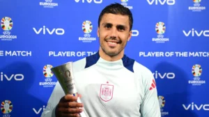 Rodri with his Vivo Player of the Match award following Spain’s win against Georgia